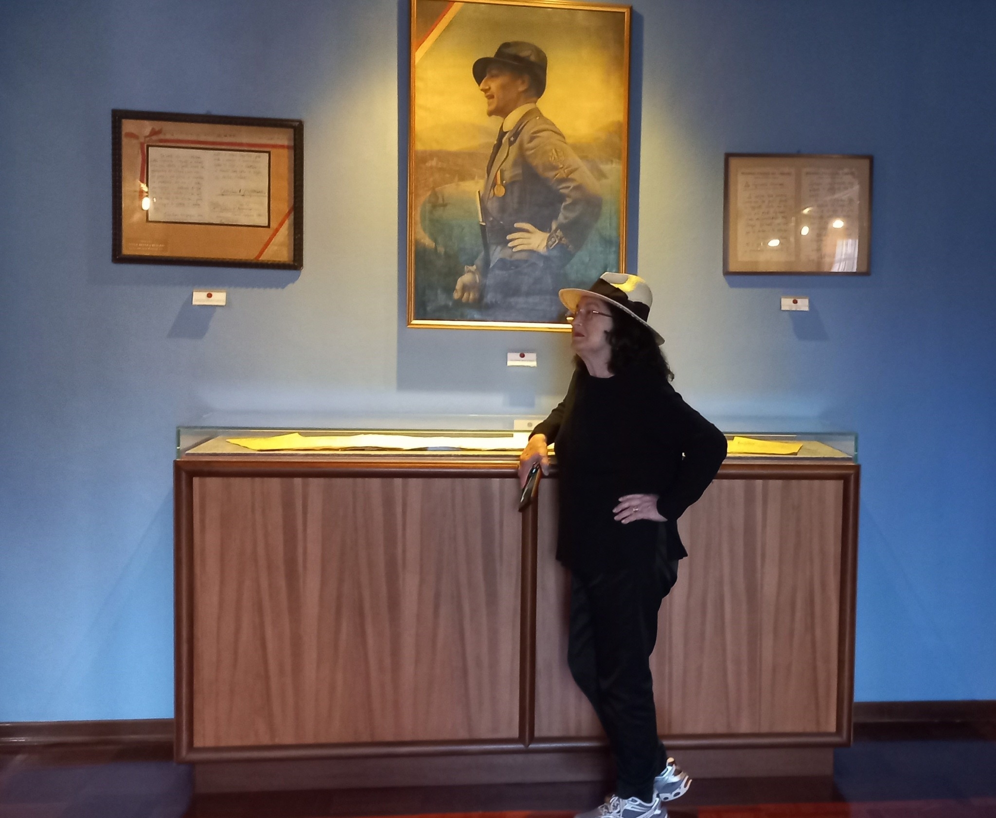 Eppure, visitando il Vittoriale, ci si accorge che questo spettacolo non era solo strategia, ma vera ossessione. I 33 mila libri, in parte ereditati dal vecchio proprietario della casa nel 1921, in parte accumulati più che letti, i corridoi tappezzati di volumi, le stanze piene di reliquie e feticci, l’aereo che incombe dal soffitto dell’auditorio, o fuori nel parco con un delizioso (quello sì) ruscelletto), la nave che spunta dal verde, il cimitero dei cani, il roseto forse rigoglioso ora spoglio, e l’intimo (chiamato segreto) del suo abbigliamento con quello delle sue donne, il profumo Nunzia, il mausoleo, le tante armi sparse, parlano di un uomo prigioniero di sé stesso, incapace di liberarsi dalla necessità di lasciare traccia, di monumentarsi. Non è il genio sereno che guarda dall’alto, ma il collezionista ossessivo compulsivo che non sopporta il vuoto. Perfino la sua immagine di eroe guerriero, che tanto piacque a un’Italia in cerca di miti virili, è segnata da tratti farseschi: la perdita di un occhio in un incidente aereo lo costrinse a dettare il Notturno (1916), opera certo intensa, ma nata anch’essa dal dolore trasformato in spettacolo.