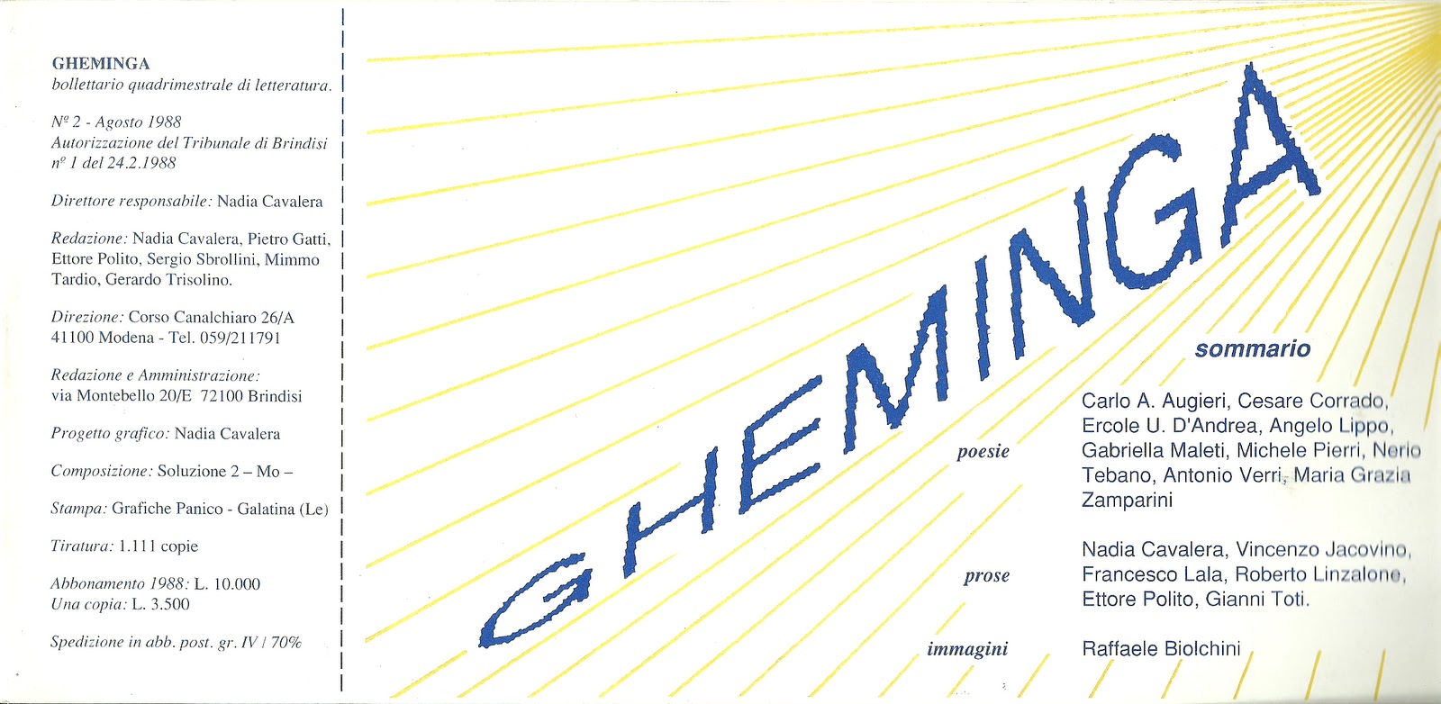 Dove, per l’evolversi di una libera scelta (venuta meno un’opportunità a Roma), mi ero trasferita con la famiglia nel luglio, e dove Gheminga, nonostante i miei sforzi di tenuta, non superò il distacco. Le troppe difficoltà della lontananza ne bruciarono la scorza del sogno originario e, tra i contorcimenti, rimase un nudo semplice «Bollettario. quadrimestrale di scrittura e critica», oggi al 21° anno.