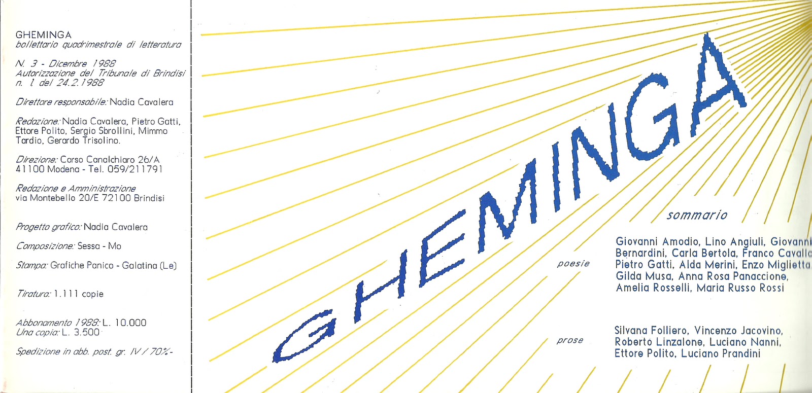 La nostra GHEMINGA quindi si pone il semplice obiettivo di essere spassionata ma qualificata vetrina della produzione letteraria nel Brindisino, senza mai comunque perdere di vista le voci più significative del resto del Salento e dell’intero panorama nazionale, lungo un itinerario progettuale che non potrà che delinearsi soltanto progressivamente nel tempo. Quando, grazie anche ad incontri, dibattiti e varie iniziative che la rivista intende promuovere, recuperati i lunghissimi anni di isolamento, più evidente potrà risultare la nostra “ecceità”.